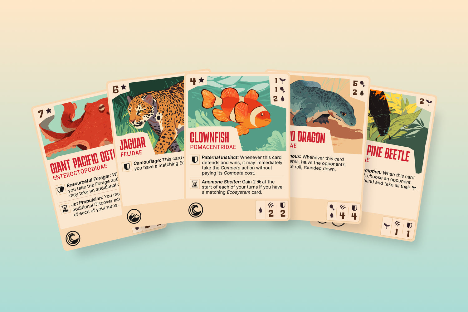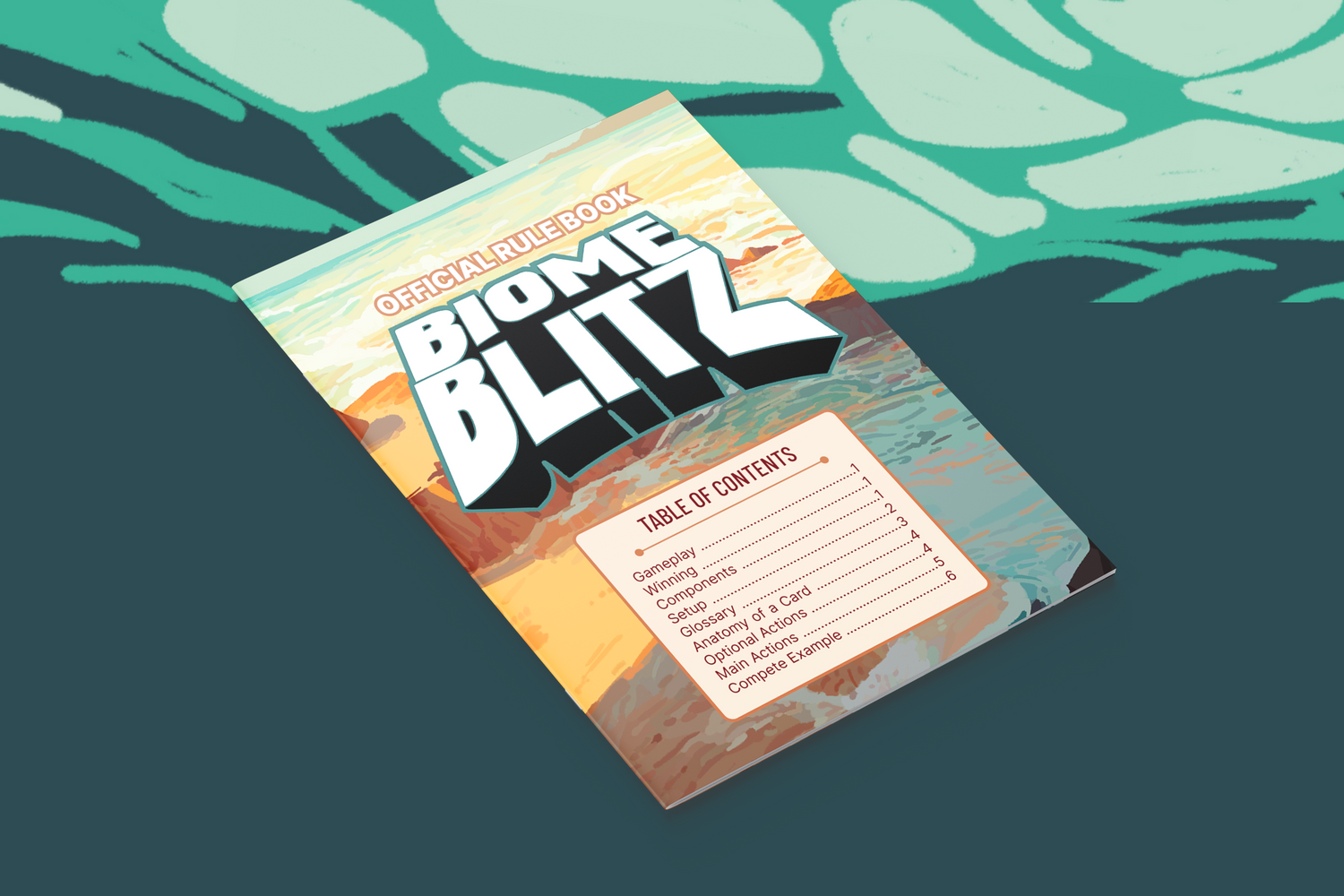 Biome Blitz is a competitive resource-management card game surrounding animals from all types of ecosystems. From insects to big cats, everyone has a fair shot at competing for the win.